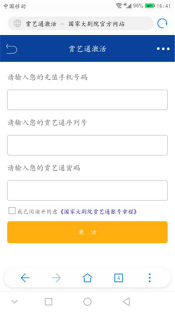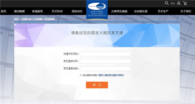 ??3.按要求輸入持卡人的手機(jī)號(hào)碼,賞藝通卡號(hào),以及激活碼,閱讀并勾選《國(guó)家大劇院賞藝通賬號(hào)章程》后,點(diǎn)擊激活按鈕,完成賞藝通激活;