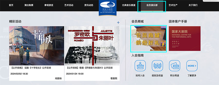 ??1.登錄國(guó)家大劇院官網(wǎng),若用戶(hù)非官網(wǎng)會(huì)員,可先注冊(cè);注冊(cè)完成,登錄成功后,點(diǎn)擊會(huì)員俱樂(lè)部,進(jìn)入會(huì)員商城;