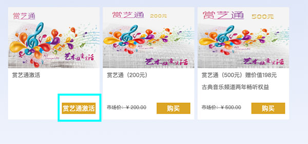 ??2.進(jìn)入會(huì)員商城頁(yè)面,可以看到賞藝通,點(diǎn)擊進(jìn)入,選擇賞藝通激活;