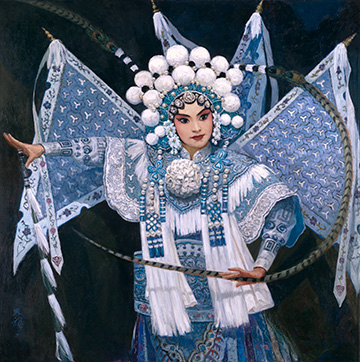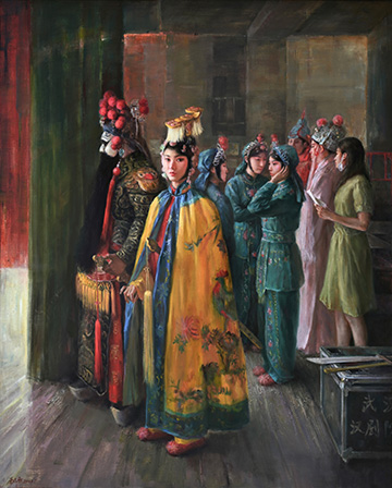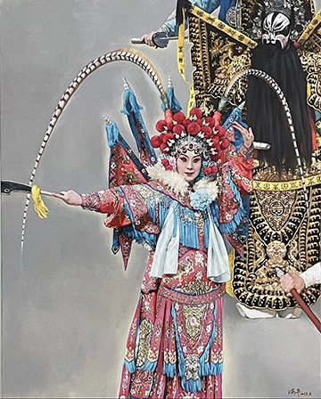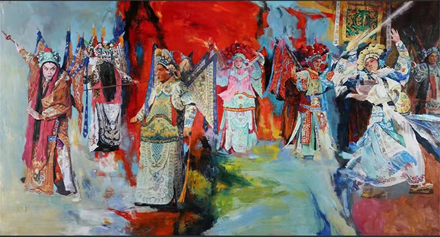 ??戲曲是中華優(yōu)秀傳統(tǒng)文化的瑰寶。從妝容服飾的色彩美,到舞臺布景的意境美,再到唱念做打的形式美,戲曲藝術(shù)的獨(dú)特魅力經(jīng)久不衰。油畫作為百余年前從西方傳入中國的視覺藝術(shù)形式,在一代又一代中國藝術(shù)家對油畫民族化的不斷探索中,將戲曲與油畫加以融合,不僅為戲曲藝術(shù)的表現(xiàn)和傳播提供了新的方式,也為油畫藝術(shù)的創(chuàng)作聚焦了新的主題,令國粹藝術(shù)之醇厚與絢麗油彩之芬芳在碰撞融合中產(chǎn)生耀眼的火花。