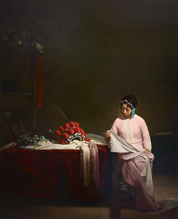 ??戲曲即人生,欣賞戲曲即體驗(yàn)人生。油畫家畫戲曲故事、塑造戲曲人物的緣由或動機(jī),都在于與戲曲中人物的命運(yùn)產(chǎn)生心靈的共鳴,創(chuàng)作的過程是一種"入戲"的過程。為此,欣賞戲曲題材的油畫作品,重要的是從畫家筆下的形象看到一種種人生和命運(yùn),在視覺的"入戲"中獲得更多的審美感受。