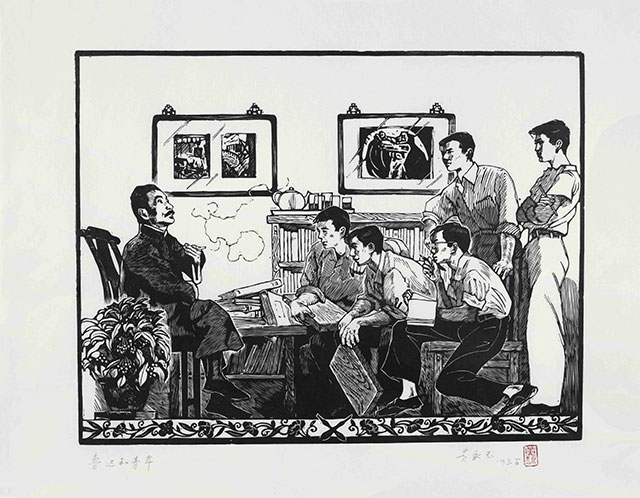 魯迅先生和青年木刻工作者 黃永玉 35cm×45cm 黑白木刻 1954年