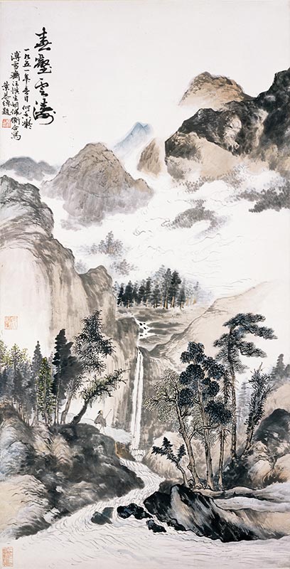 《春壑云濤》 何香凝、溥雪齋、汪慎生、胡佩衡合畫,葉恭綽題款 131cm×67cm 設色紙本 1951年 何香凝美術館藏