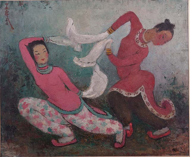 ??1950年代后,潘玉良的藝術進入“從心所欲不逾矩”的圓融之境。彩墨愈發(fā)純熟,油畫亦融入東方意韻。源于對祖國的思念,中國民間人物題材占據(jù)其創(chuàng)作重心,《中國舞》《雙人扇舞》等作品融入了年畫色彩與壁畫圖式,作品中“依稀可見中國年畫、壁畫、版畫甚至刺繡的多樣化風格”。此時的潘玉良已抵達了“合中西于一冶”的藝術高峰,技法隱退,心性流露,光華自內而外,溫潤明亮。