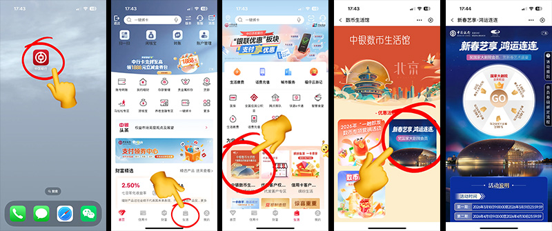 ??持有中行數(shù)字人民幣二類及以上錢包的北京地區(qū)中行手機(jī)銀行客戶,登錄手機(jī)銀行,進(jìn)入活動(dòng)頁(yè)面即可參與!