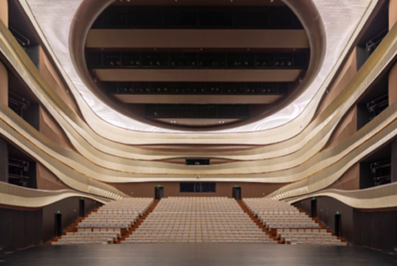 臺湖劇場觀眾席座區(qū)以香檳色為主色調(diào)配以淺灰色座椅,共有831席(含固定座椅717席,樂池活動座椅114席)。墻面采用GRG墻面及部分軟包,控場中頻混響時間為1.7秒,達(dá)到了聲學(xué)設(shè)計(jì)要求,讓觀眾能享受到最佳的音響效果。觀眾席頂部場燈采用動態(tài)LED矩陣,通過智能控制系統(tǒng),既能達(dá)到觀眾席照明亮度需求,還能設(shè)置動態(tài)變化效果,提升觀眾席視覺感受。
