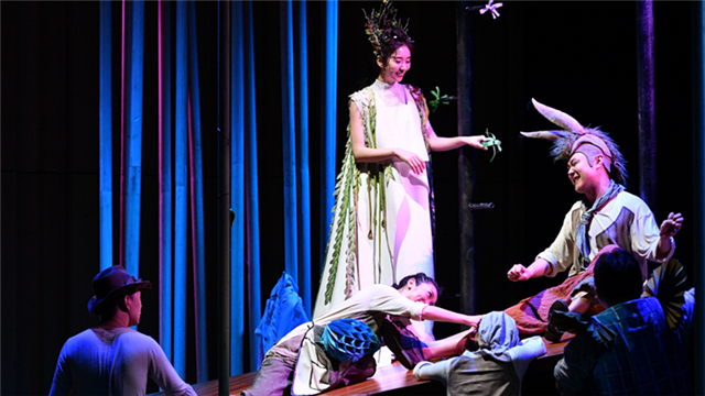 ??作為國(guó)家大劇院首度制作的莎翁經(jīng)典話劇,《仲夏夜之夢(mèng)》著力對(duì)莎士比亞原著文本進(jìn)行深度梳理,回歸經(jīng)典的同時(shí)與時(shí)代語(yǔ)境相呼應(yīng)。舞臺(tái)上的70根“木棍”,符號(hào)化地呈現(xiàn)出空間的流動(dòng)性。在城市部分,木棍的放置突出規(guī)律和秩序,而一旦進(jìn)入森林,木棍、月牙形的臺(tái)板等則突出自然和隨意。舞臺(tái)上的“變化”無(wú)所不在,既為表演提供了更多可能,也為觀眾的想象提供了更多留白……