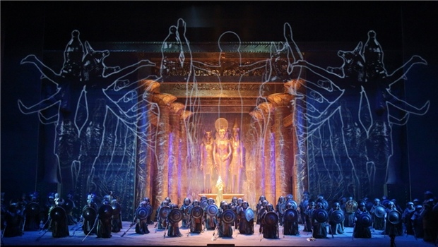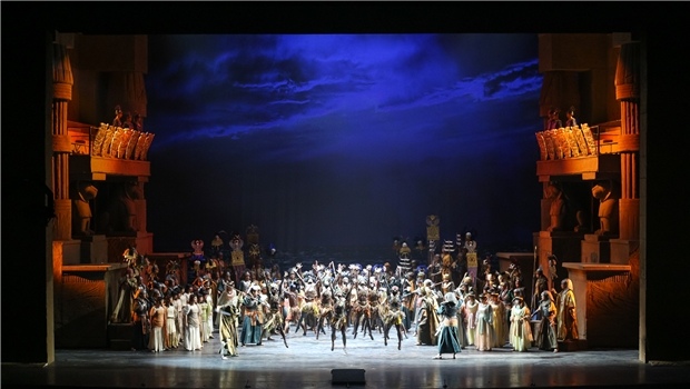 第一幕第二場,拉達(dá)梅斯的“浪漫曲”。威爾第在《阿依達(dá)》的音樂段落名稱中沒有使用Aria(詠嘆調(diào))這一傳統(tǒng)稱謂,而是用Romance(浪漫曲)來稱呼男女主角的獨(dú)唱段落。在18世紀(jì)末19世紀(jì)初的歐洲歌劇中,“浪漫曲”通常所指的是規(guī)模比詠嘆調(diào)小,速度舒緩的獨(dú)唱段落。而《阿依達(dá)》中的三段浪漫曲,無論規(guī)模還是內(nèi)容,其實都是典型的“詠嘆調(diào)”。