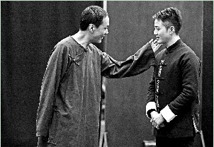 馮遠(yuǎn)征和余少群這對(duì)師徒昨天展示了一小段對(duì)手戲(如圖),馮遠(yuǎn)征在劇中飾演老奸巨猾的大官僚蘇鴻基。這個(gè)角色也突破了馮遠(yuǎn)征以往的人物形象,他一襲長(zhǎng)褂,賦予了形象一些儒雅,余少群在該劇中的角色是他熟悉的男旦,因此駕馭起來(lái)游刃有余,一舉一動(dòng)都具備戲曲程式化的講究。扮演大官僚蘇鴻基四姨太的是北京人藝青年演員程莉莎,她這個(gè)角色被馮遠(yuǎn)征當(dāng)成金絲雀,同時(shí)和余少群也因命運(yùn)相似產(chǎn)生一段戀情。排練中,余少群和程莉莎首度飾演情侶,不過(guò)他們默契十足,從眼神到動(dòng)作表演都看得出是精心設(shè)計(jì)的。