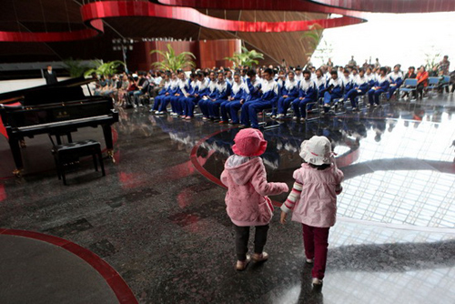 第一場歌劇節(jié)觀摩活動現場 兩個小朋友高興的走進現場