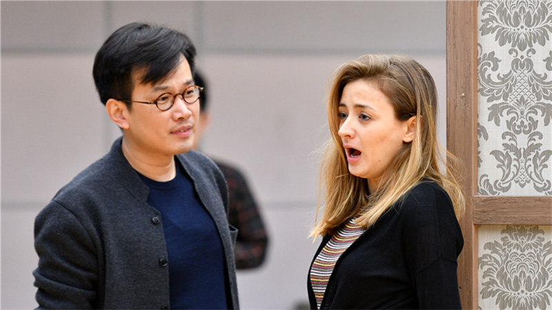 ??11月22日下午,記者在國(guó)家大劇院排練廳看到了歌唱家們排練劇中第二幕第二場(chǎng)的精彩片段。這一場(chǎng)景發(fā)生在福德家的客廳內(nèi),由男中音羅伯特·德坎迪亞飾演的法斯塔夫身著盛裝,按照約定來與女中音歌唱家莉莉·約斯塔飾演的梅格·佩奇夫人幽會(huì),殊不知整個(gè)幽會(huì)都是眾人設(shè)好捉弄法斯塔夫的圈套。