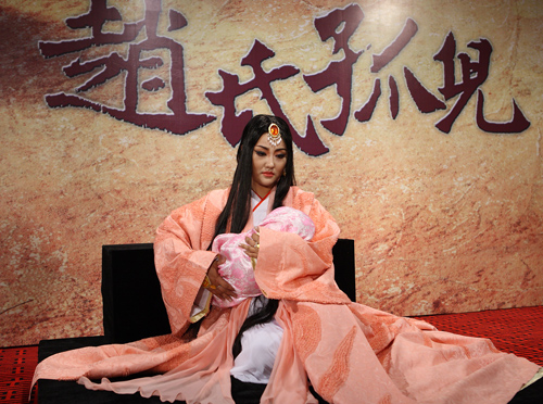 陳薪伊:截止到昨天,我們的初排已經(jīng)基本完成,下一步是要進(jìn)行細(xì)致化的排演?,F(xiàn)在看來我們這部作品肯定是成功的。真正進(jìn)行戲劇排練的時間僅僅有9天。大家今天看到的形象,都是世界有名的大義士,被人們歌頌。在我的歌劇中,趙盾是第一位大義士,為維護(hù)百姓而死在了昏君的劍下,并不是每一個《趙氏孤兒》的版本都是這樣安排的,但在我的版本里,一定要是這樣,這個故事的根基才牢固。而韓厥則是一個十八九歲非常單純、非常干凈的孩子,是一個沒有被污染過的人,他在前面的表演中很兇,但是當(dāng)他看到嬰兒的一瞬間,他變了,善良的因子被激發(fā)出來。而劇中的大反派屠岸賈,我認(rèn)為他是歷史劇中最頂級的邪惡分子,我不要他被美化,他的形象一定要是丑陋兇殘的,我在挑選演員之初,一定要一個1.9米的男高音,這樣條件的演員極少,很不容易才找到了他(王凱)。這個男高音沒有詠嘆調(diào),這在歌劇中是很少見的,但是卻十分難唱。
