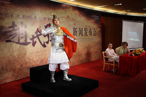 發(fā)布會當(dāng)天,袁晨野、周曉琳、金鄭建、張英席、王傳越五位主演首次“披掛上陣”以劇中造型示人,并現(xiàn)場演唱了劇中的精彩唱段:程嬰的《我是一個醫(yī)生》、公主的《托孤》以及趙武的《雨越下越猛》。雖然在發(fā)布會上展示的僅是該劇的冰山一角,卻以深入人心的婉轉(zhuǎn)旋律和中國式的壯麗抒情打動了在場的每一位觀眾。