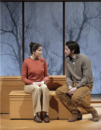 ??這版《婚姻生活》舞美極簡,兩個高矮長短有別的木質(zhì)長條凳、幾叢樹枝、一只飛鳥,由內(nèi)至外構(gòu)建一對中產(chǎn)夫妻的居室環(huán)境,充當(dāng)伯格曼電影中床與沙發(fā)的功用,見證精神學(xué)講師約翰與律師瑪麗安吵吵鬧鬧、分分合合的過程,道出婚姻生活“相愛相殺”的本質(zhì)。