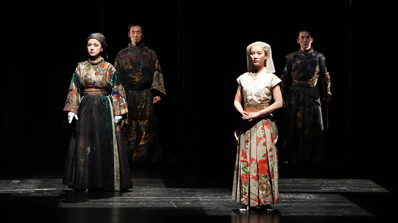 在鈴木忠志的舞臺(tái)上,令人最感興趣的莫過于他雜糅了不同國家文化的要素。在此版《李爾王》中,除了五國演員使用母語演出外,整部劇的背景音樂、服裝造型也充滿了跨文化的國際性?!胺b使用了很多國家的素材,日本和歐洲的服飾元素雜糅其中,觀眾也能從劇中聽到巴赫、柴科夫斯基的音樂元素。使用多個(gè)國家的優(yōu)秀文化元素,讓它們?cè)谖枧_(tái)上碰撞融合,是我的戲劇觀念?!扁從局抑菊f道。