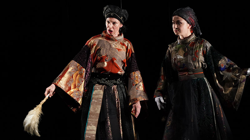 在當(dāng)晚的舞臺(tái)上,燈光暗下,“李爾”坐著輪椅緩緩步入舞臺(tái),垂垂老矣的他孤獨(dú)地住在醫(yī)院里,身旁的護(hù)士念著《李爾王》的故事,他則借此追憶自己的一生。舞臺(tái)上演員在大部分時(shí)間里都保持上身端直,行走時(shí)滑行的腳步近乎無聲,動(dòng)靜有致發(fā)聲沉穩(wěn)。在最初的版本中,李爾王的三個(gè)女兒均由男演員飾演,與日本能劇的演出傳統(tǒng)和莎士比亞時(shí)期的演劇傳統(tǒng)一致。而在此次復(fù)排中,三位女兒分別由來自美國、俄羅斯與中國的女演員共同演繹,不同語言及文化背景的演員以“鈴木訓(xùn)練法”的統(tǒng)一規(guī)則為橋梁,打破了異質(zhì)文化的藩籬,獨(dú)特的表演方式也深深吸引著每一位觀眾。