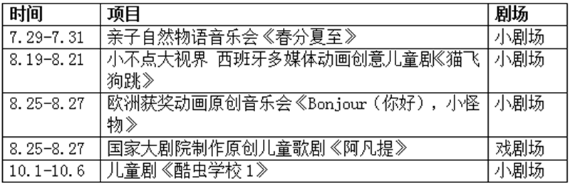 ??此外,2022國(guó)家大劇院兒童戲劇季也將在7月29日至10月6日,為小觀眾們帶來(lái)5臺(tái)24場(chǎng)多彩兒童劇目。國(guó)家大劇院原創(chuàng)兒童歌劇《阿凡提》、自然物語(yǔ)音樂(lè)會(huì)《春分夏至》、西班牙多媒體動(dòng)畫(huà)創(chuàng)意兒童劇《貓飛狗跳》、歐洲獲獎(jiǎng)動(dòng)畫(huà)原創(chuàng)音樂(lè)會(huì)《Bonjour(你好),小怪物》及兒童劇《酷蟲(chóng)學(xué)校1》,開(kāi)啟夏日兒童戲劇生活新體驗(yàn)。購(gòu)票點(diǎn)擊:2022國(guó)家大劇院兒童戲劇季