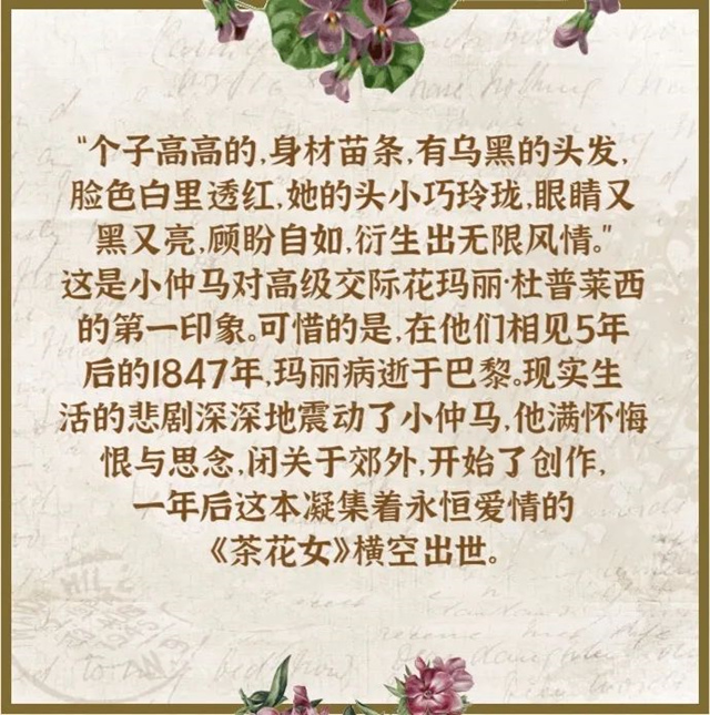 ??威爾第在觀賞過由小仲馬的這本小說為藍本改編的戲劇《茶花女》后,備受感動,雖1853年首演時,由于飾演薇奧萊塔的女高音體型過胖,完全沒有身患肺癆的說服力,再加上一些人認為這部歌劇有些離經叛道,而慘遭失敗。但兩年之后,歌劇《茶花女》更換主角再次上演,卻立即造成轟動。小仲馬都感嘆:“50年后,也許誰也記不起我的小說《茶花女》,但威爾第卻使它成為不朽。”