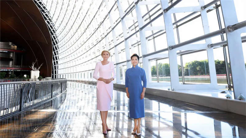 ??6月24日下午,國家主席習(xí)近平夫人彭麗媛與陪同波蘭總統(tǒng)杜達對中國進行國事訪問的波蘭總統(tǒng)夫人阿加塔共同參觀中國國家大劇院。